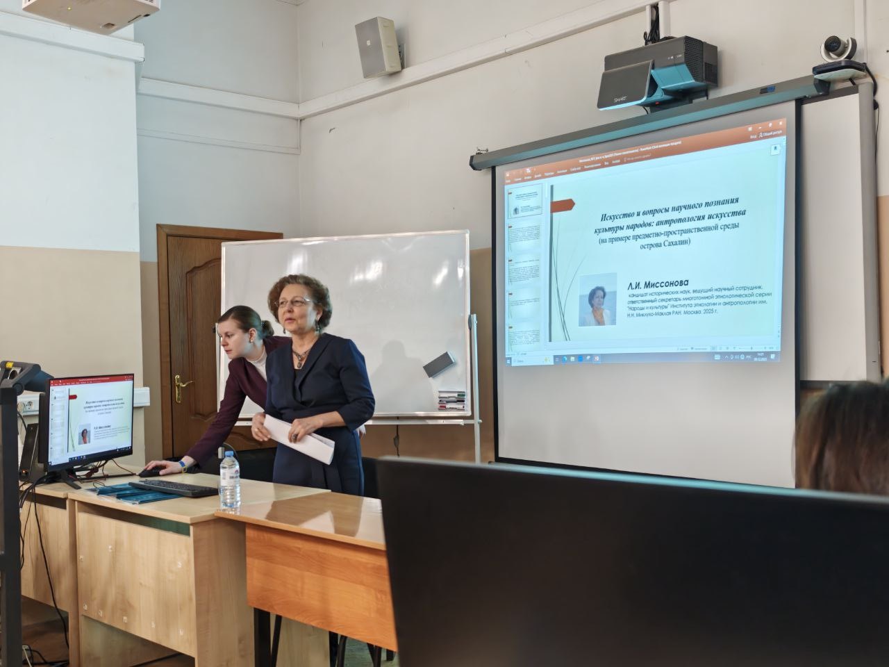 На пленарном заседании ведущий научный сотрудник ИЭА РАН Людмила Ивановна Миссонова выступила с докладом, раскрывающим возможные пути научного познания культуры народа с точки зрения антропологии искусства. Тема была рассмотрена на примере предметно-пространственной среды острова Сахалин.