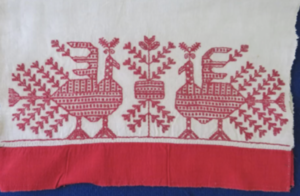 Образ водоплавающих и лесных птиц — один из основных сюжетных мотивов в финно-угорской мифологии и декоративно-прикладном искусстве. Птицы, особенно водоплавающие, по представлениям человека традиционной культуры, обладали высоким сакральным статусом, поскольку могли свободно существовать в трёх стихиях: в воздухе, на земле и в воде. Умение летать в мифологическом восприятии наделяло их божественным даром общаться с небесами, быть связующим звеном между богом и человеком. Вышитые изображения украшали повседневный и праздничный костюмы, а также предметы интерьера тверских карел. Птицы присутствовали в композициях с антропоморфными фигурами, дополняли изображения коней и растительный орнамент. Орнитоморфные элементы вышивки могли составлять и самостоятельные узоры в разных композициях: в виде ряда, где птицы ритмично следуют друг за другом, либо повернуты друг к другу и соприкасаются клювами или хвостами. Также на полотенцах часто встречались единичные крупные фигуры птиц. Шитьё выполнялось по холсту или кумачу шёлковыми, шерстяными или металлическими нитями в разных техниках: росписи, набора, тамбура, косой стежки и др.