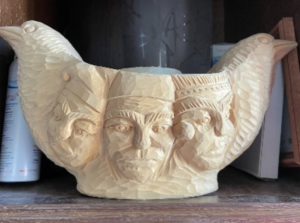 Мордовская обрядовая свеча штатол в ковше-братине. Материалы: дерево, воск