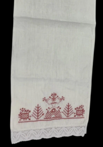 Материалы: браное ткачество льняными и хлопчатобумажными нитями, кумач, кружево, вязаное хлопчатобумажными нитями крючком