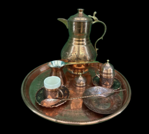 Крымскотатарский набор для кофе: поднос табакъ, кофеварка джезве, кофейная чашечка къаве фильджаны, кофейник ибрык. Материалы: медь, фаянс