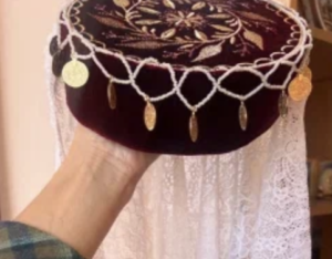 Фес и головная накидка — головной убор молодых крымских караимок, крымчачек и крымских татарок. Материал: ткань, золотные нити