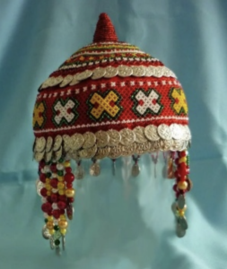 Тухья — головной убор незамужних девушек в виде полусферической шапочки. Материалы: ткань, нити, бисер, металл