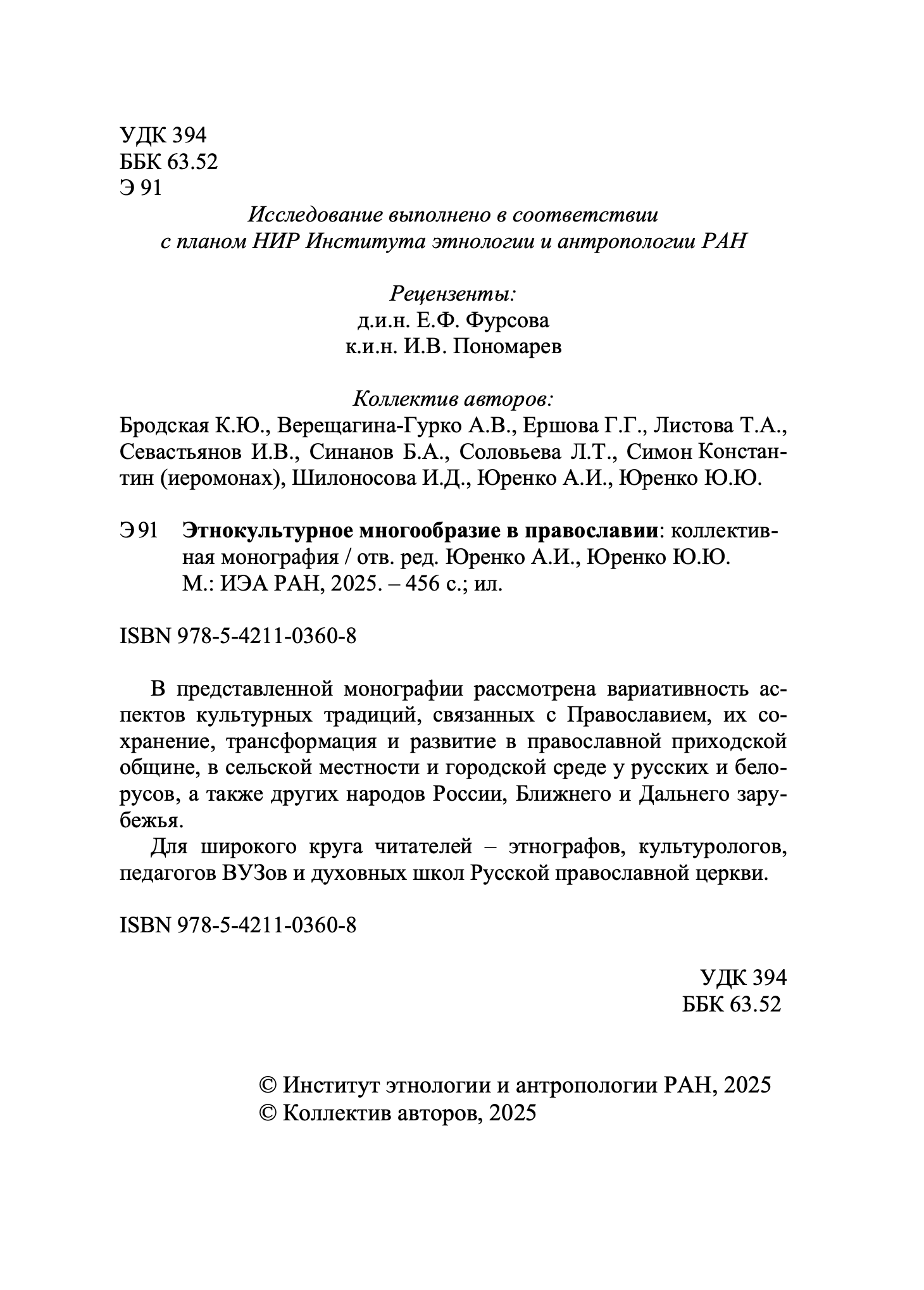 Этнокультурное многообразие в православии: коллективная монография / отв. ред. Юренко А.И., Юренко Ю.Ю. М.: ИЭА РАН, 2025. – 456 с.; ил.